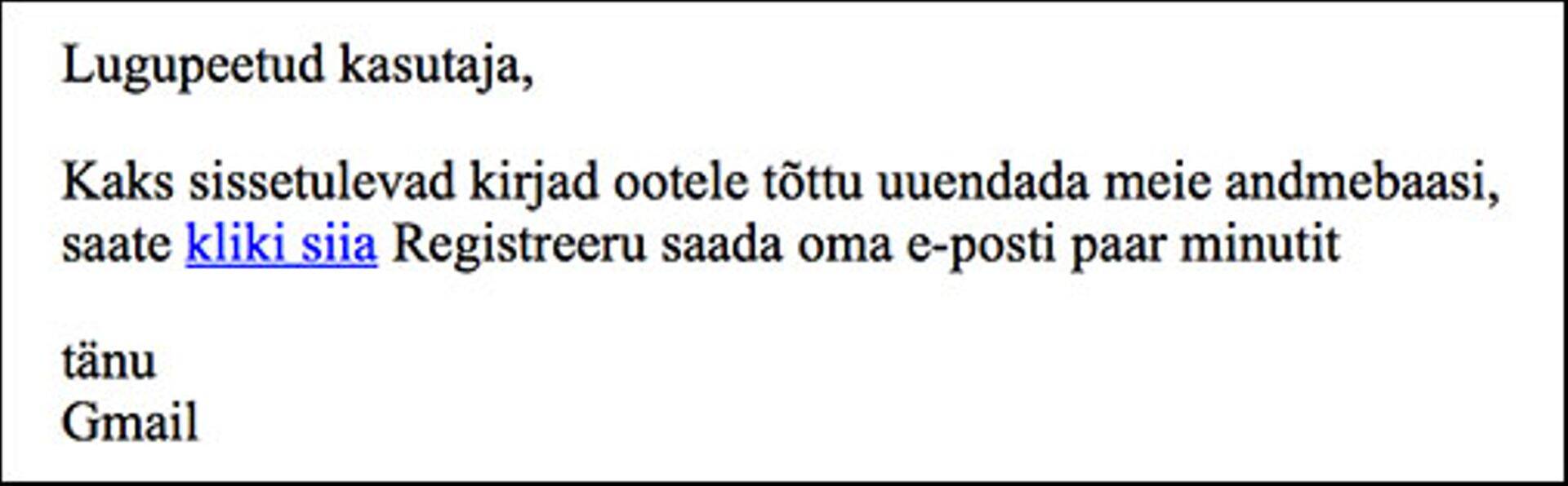 3. E-mailid, milles on näilised lingid ametlikele lehtedele, paludes sul sisestada enda kohta infot. Küberkurjategijate poolt loodud netileheküljed on sageli väga veenvad ning tõetruud. Enne enda info sisestamist, uuri antud lehekülge, et tegu oleks ikka sellega, mida ta väidab olevat.